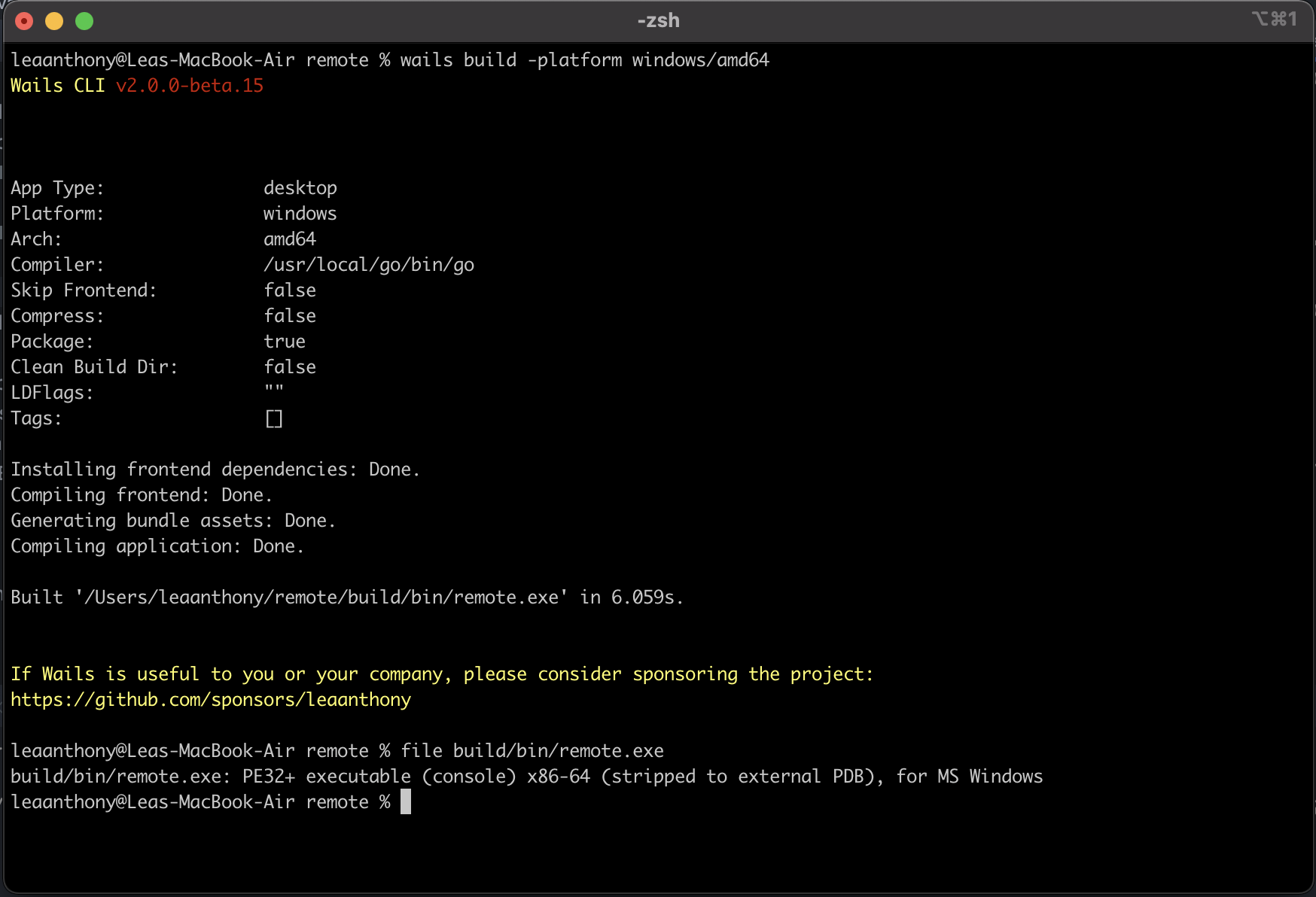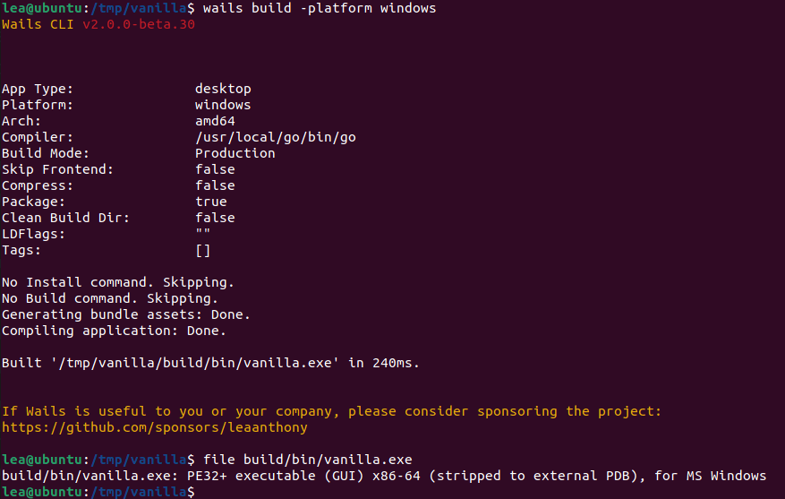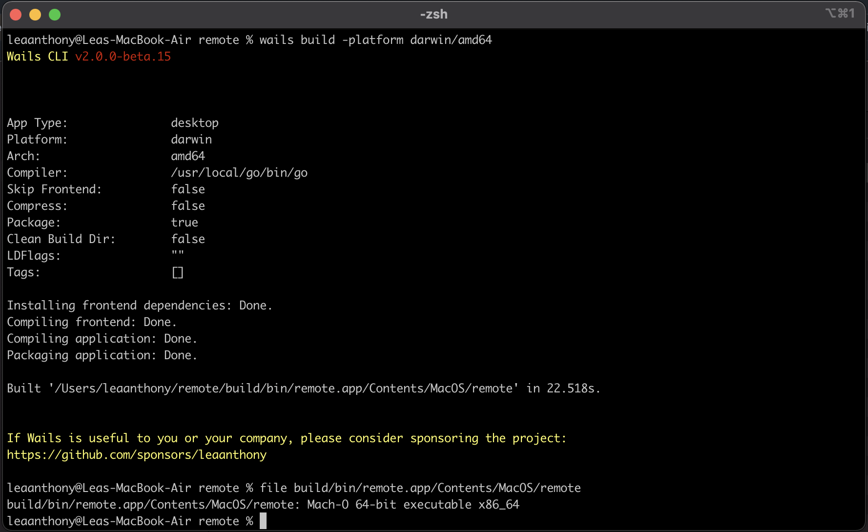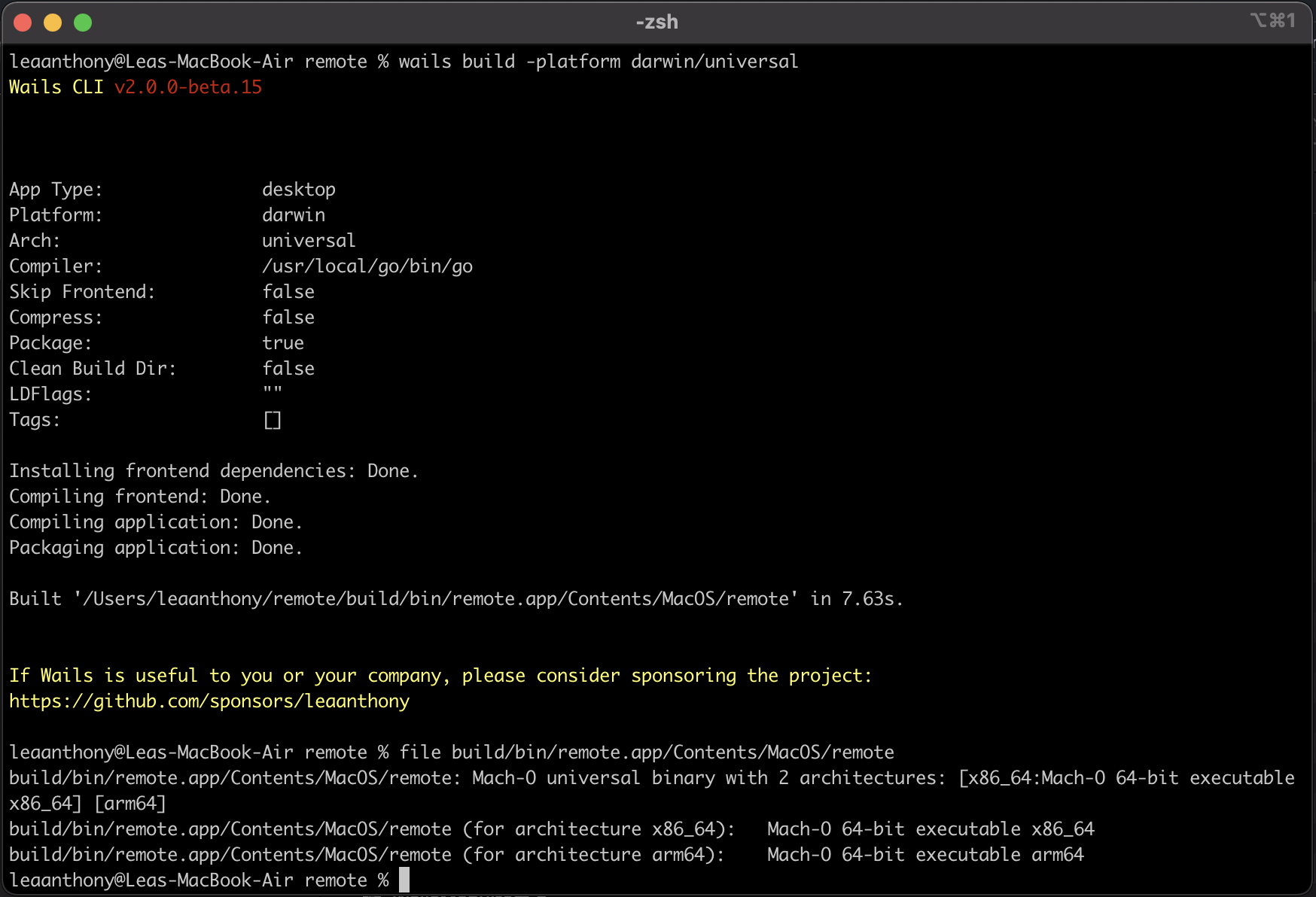 • 如果构建是针对 darwin/universal 的,它会构建 2 个二进制文件,一个用于 darwin/amd64,一个用于 darwin/arm64,然后使用 lipo 创建一个大的二进制文件